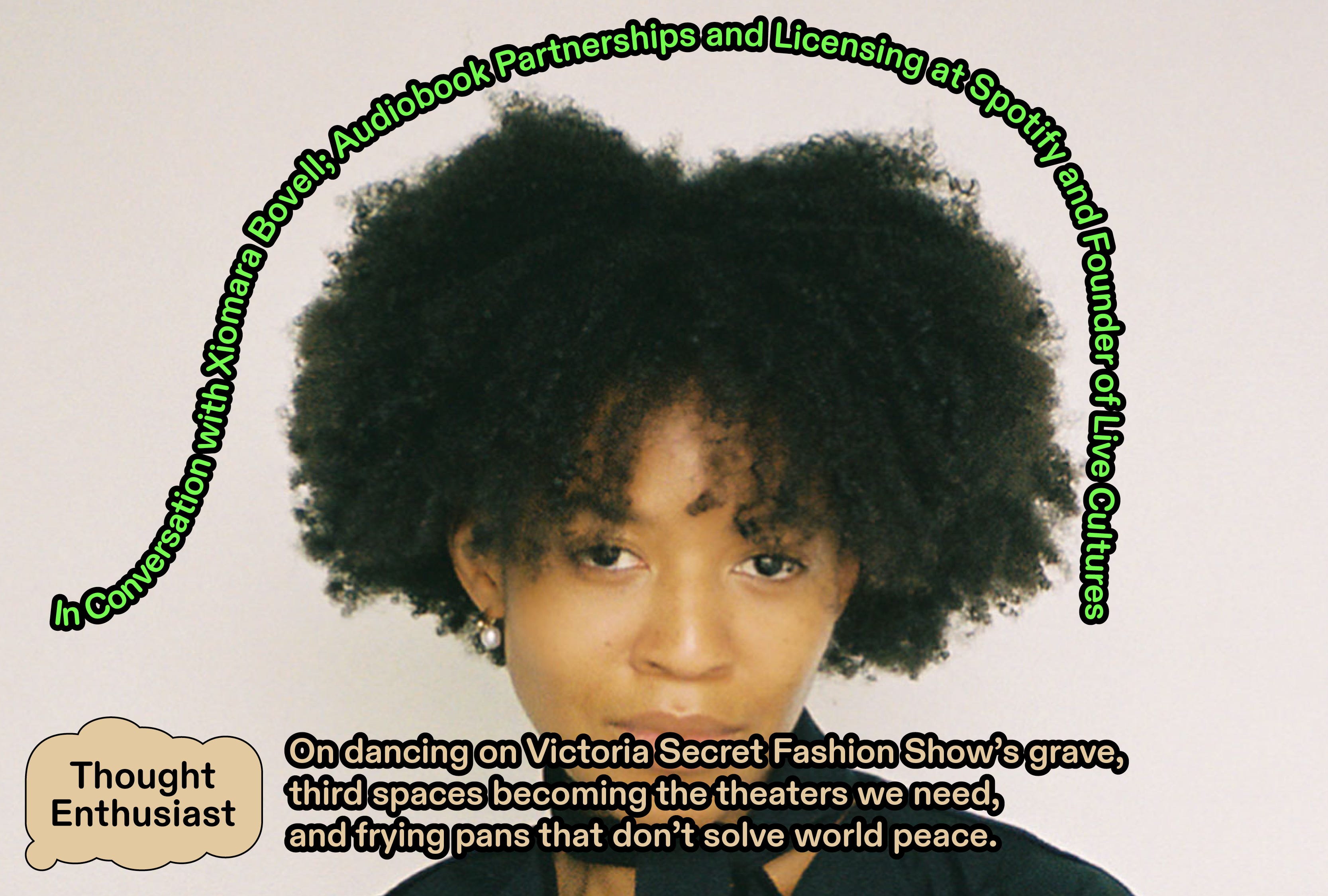 Xiomara Bovell is currently working at Spotify, managing Audiobooks Partnerships and Licensing, where she matchmakes between communities and the creatives that bring their art to the platform. She is also a trained dancer who has collaborated with James Cousins, Cameron McMillan, English National Ballet Youth Co., Pascal Merighi (of Pina Bausch’s Tanztheater Wuppertal), and Pam Tanowitz, amongst others. She simultaneously publishes one of our favorite Substacks Live Cultures, where she discusses performance and live art all over NYC.