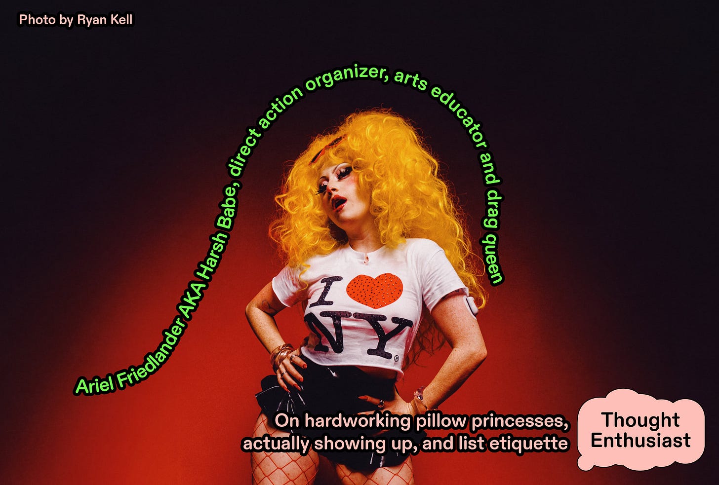 Ariel Friedlander (@harshbabe.nyc) is a political organizer and arts educator. For most of her adult life she has been a direct action organizer alongside organizations like ACT UP New York, Jewish Voice for Peace, and Gender Liberation Movement.