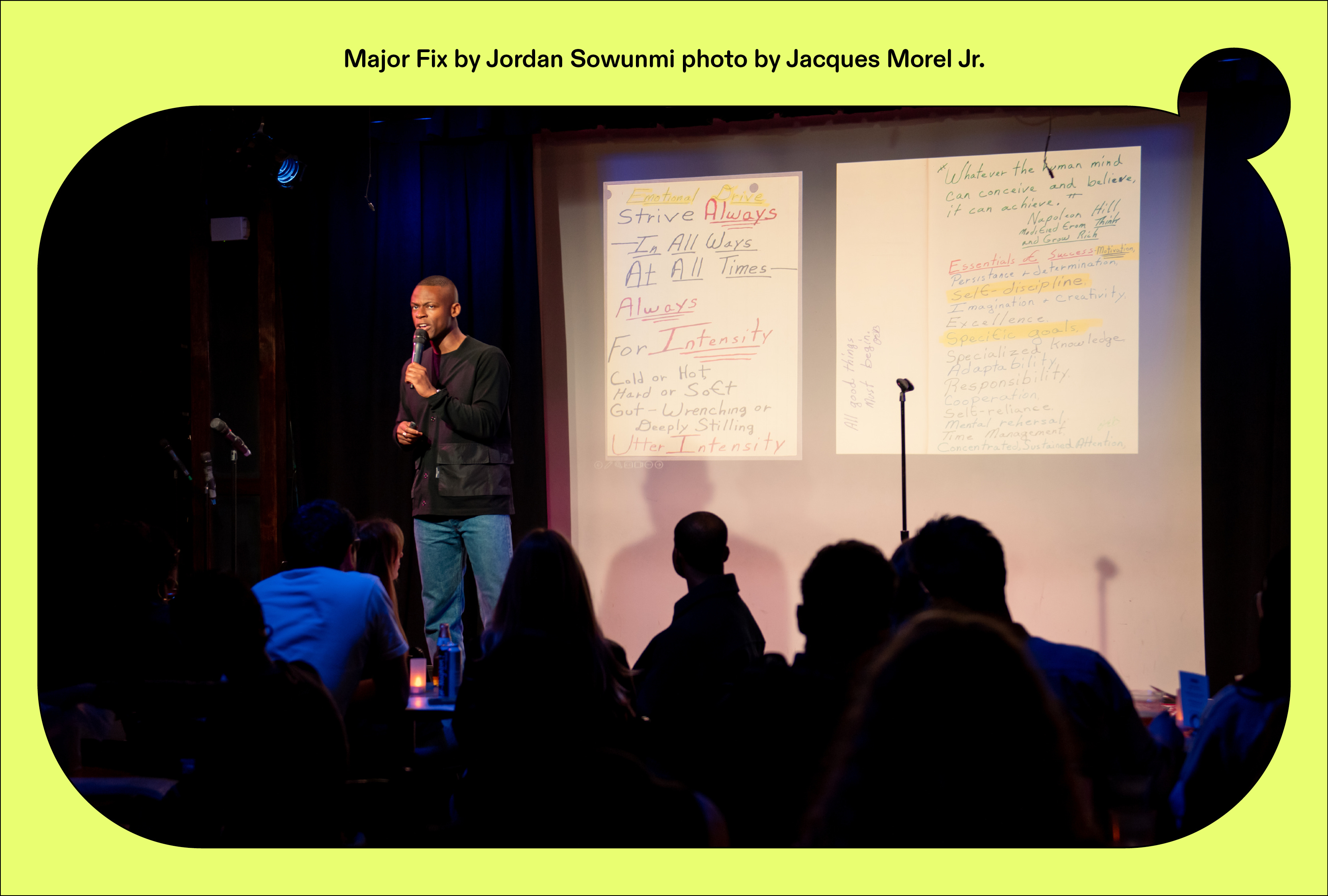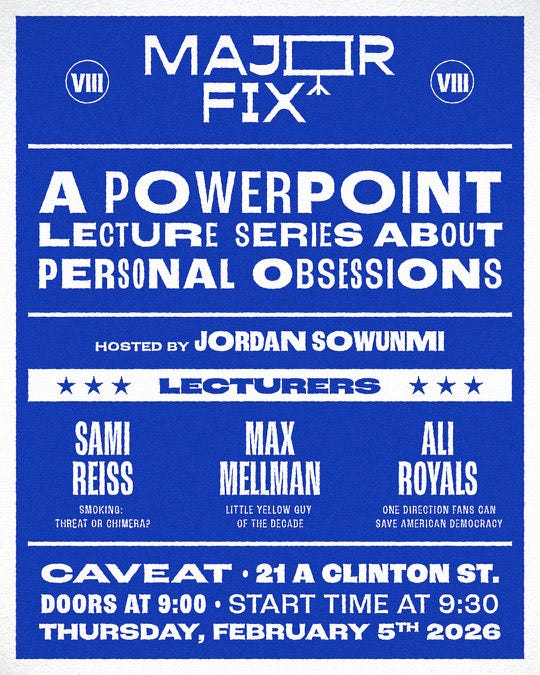 Most recently, Jordan has created Major Fix. The idea was partially inspired by a five-minute section of Jaboukie Young-White’s Comedy Central Stand-Up Presents special and Trampoline Hall. Major Fix is a PowerPoint lecture series about personal obsessions, the next of which is February 5th, featuring the following presentations: Sami Reiss: Smoking: Threat or Chimera, Max Mellman: Who Is This Decade’s ‘Little Yellow Guy’, and Ali Royals: How One Direction Fans Can Save American Democracy. Get your tickets here!